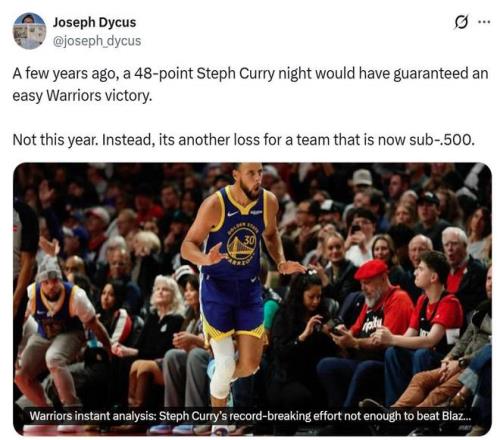 结果在库里交出如此表现的情况下,勇士队遭遇2连败,面对这样的局面,勇士队记Joseph Dycus直言不讳表示:“几年前,当库里单场砍下48分时,勇士将拿下一场大胜,现在不行了,球队又输了。”
