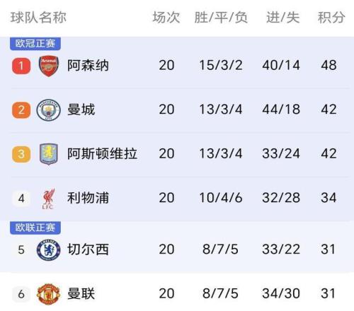 曼城连续两轮丢分后,20轮积42分位列英超第2,与20轮积48分高居榜首的阿森纳已相差6分。